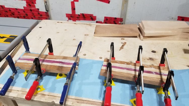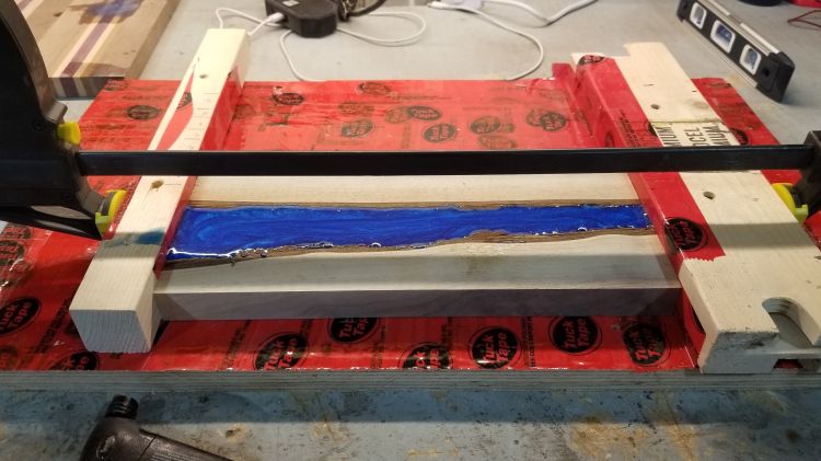 When making a river board, I take live edge pieces, cut the outside strips and invert them. I then have a wood ‘mold’ lined with Tuck Tape where the pieces are clamped down and colored epoxy poured and then left alone for a couple of days to let the epoxy set.