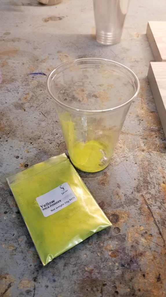 Mixing the colored powder to the mixed epoxy provides a colored epoxy. If doing multiple colors in one design it’s best to use disposable cups.
