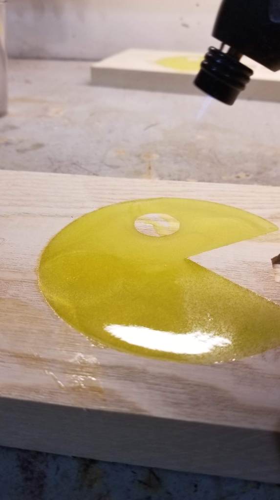 Using a small torch, I pop the bubbles that would have formed during the resin/hardener mixing. This is essential, especially the deeper the pour.
