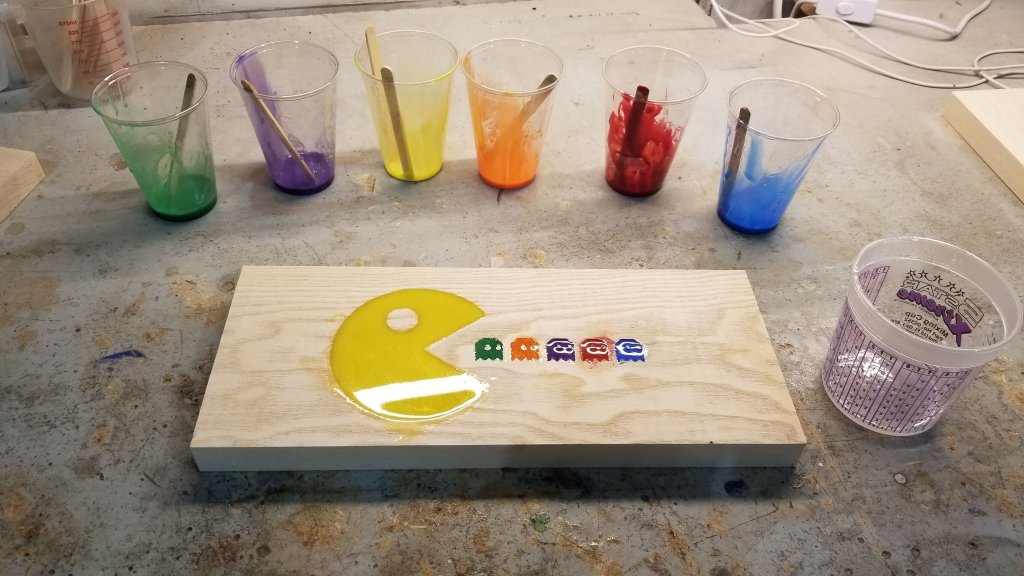 Now it’s time to pick the colors that I want to mix into the epoxy that will be poured onto the board design.